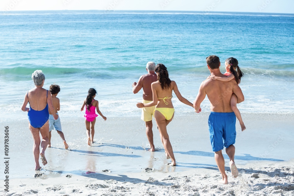 Fotografie Cute multi generation family running in the sea