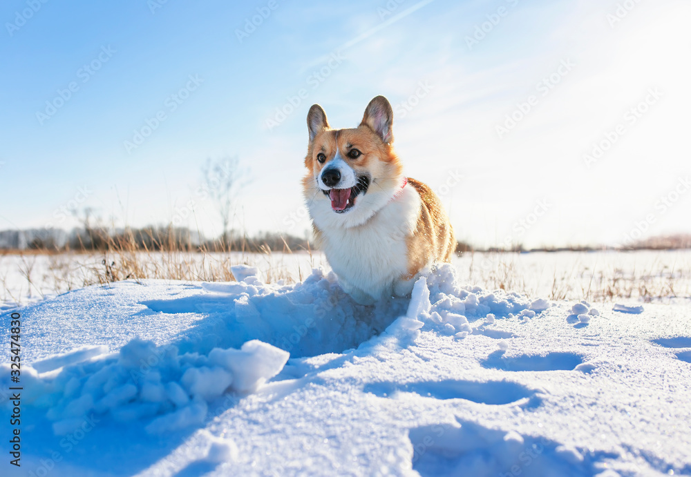 Fotografie cute red Corgi dog puppy walks in a winter Sunny Park having fun running through