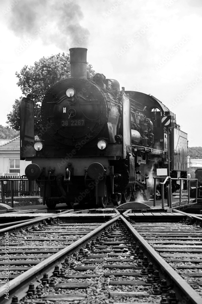 Fotografie Dampflokomotive Lok schwarz-weiß Graustufen Drehscheibe Museum Tenderlok Attrakt