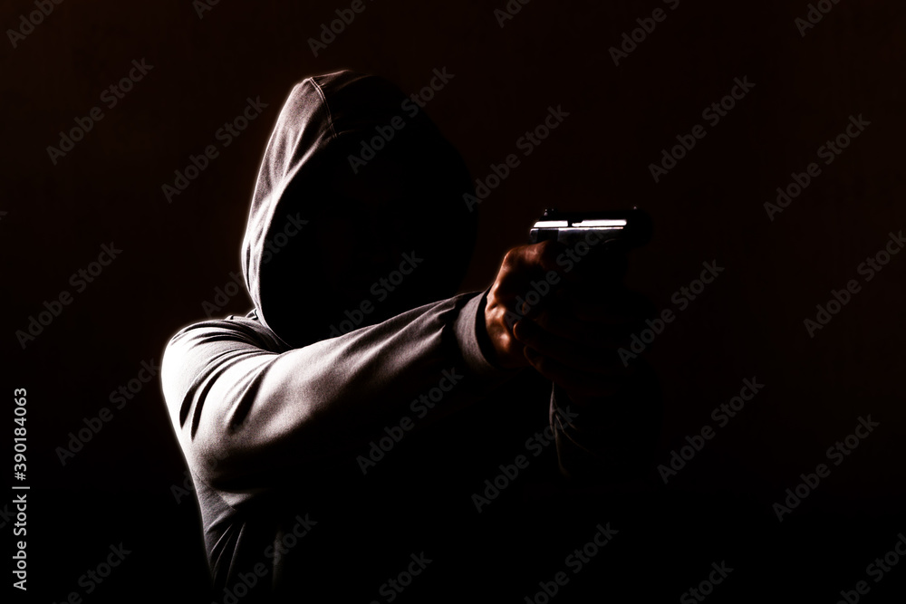 Obraz na plátně dangerous hooded man threatens with a pistol shot in his hands