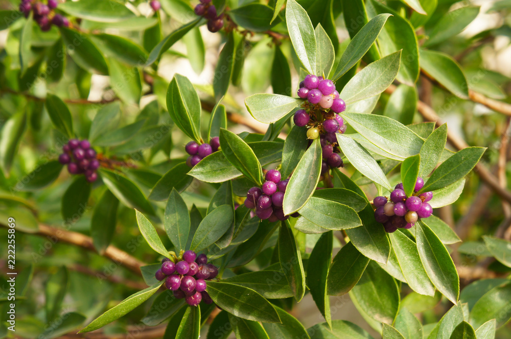 Obraz na plátně Daphne odora or winter daphne green plant with purple berries