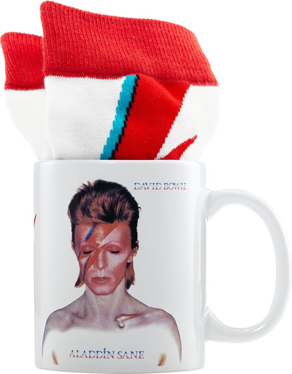 Rocková dárková sada David Bowie s ikonickým motivem blesku Aladdin Sane obsahuje keramický hrnek o objemu 315 ml a pohodlné ponožky ve velikosti 41–45.