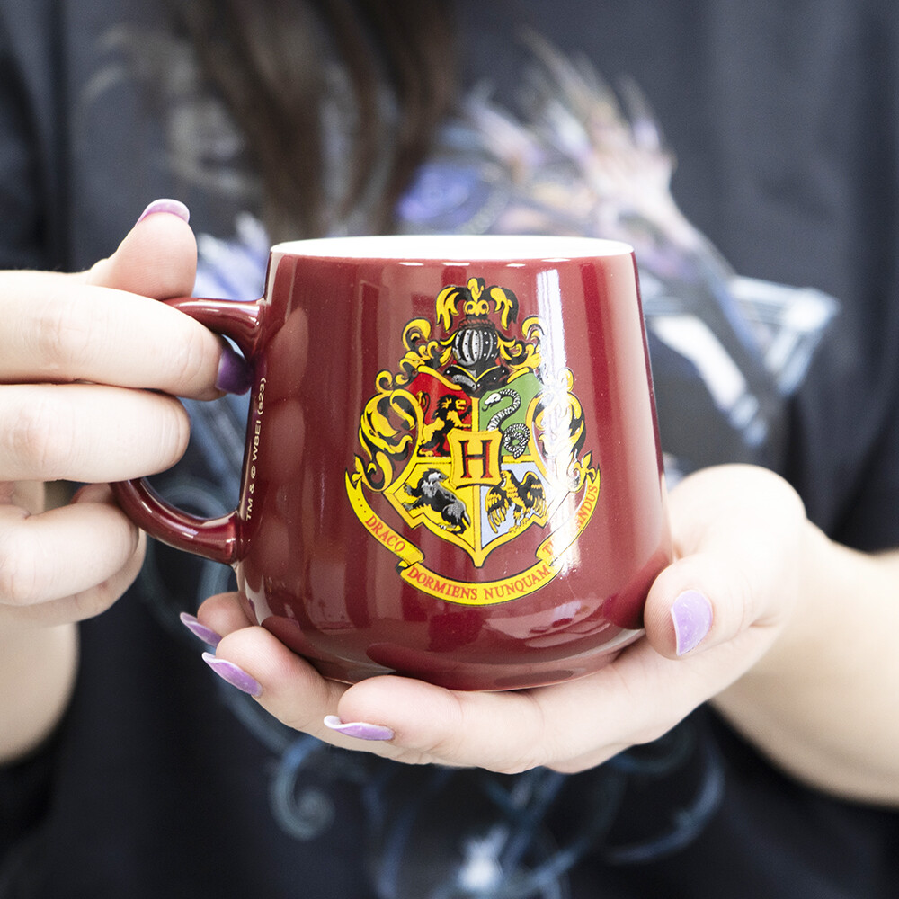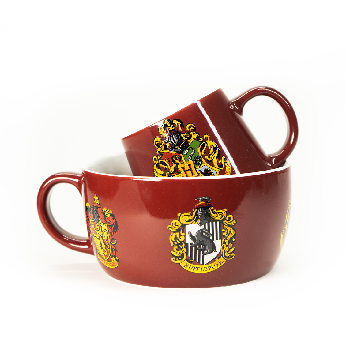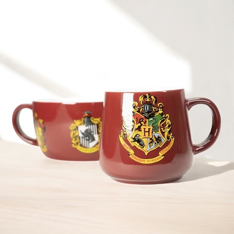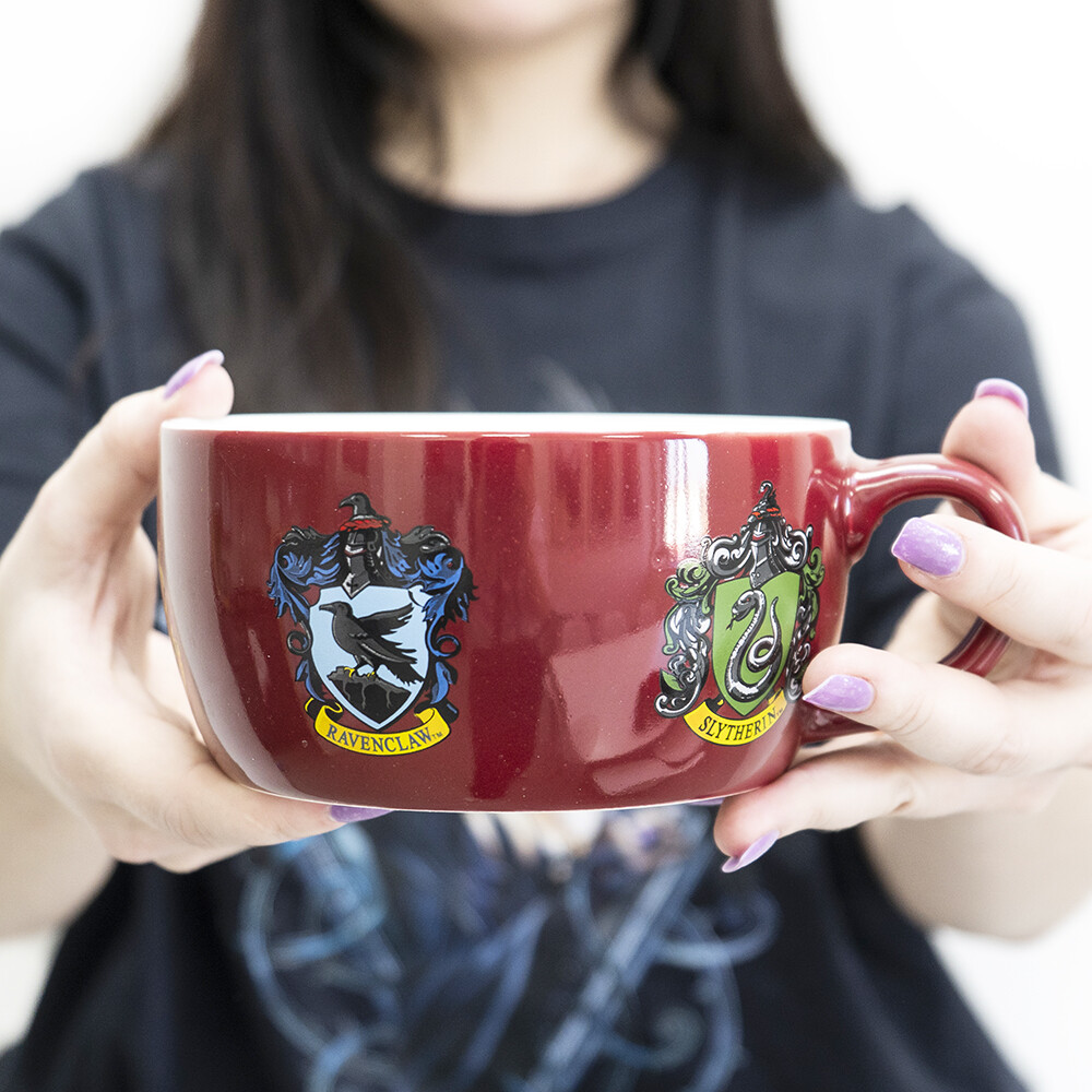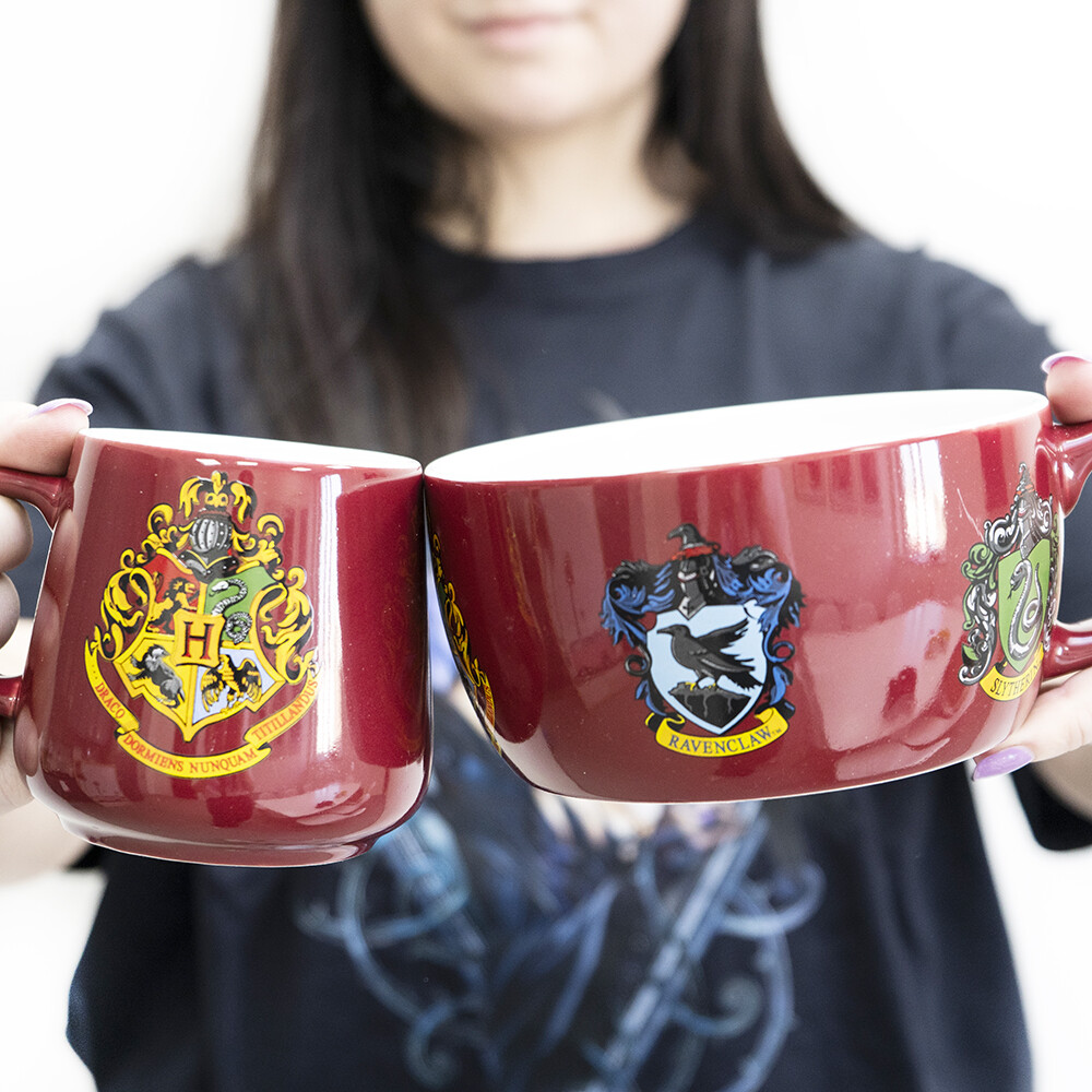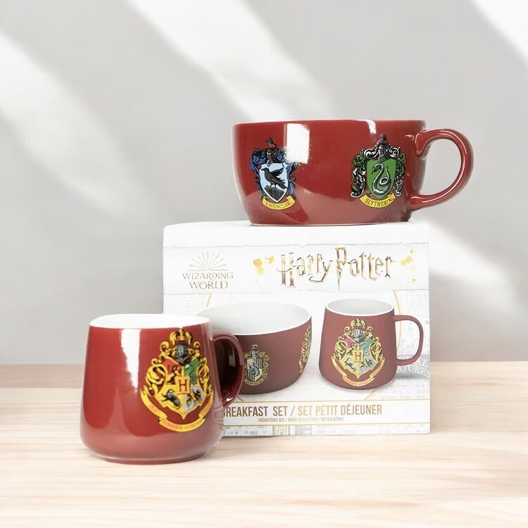 Keramický snídaňový set Harry Potter „Crests“ spojuje hrnek 385 ml (cca 9 × 9 cm) a misku 858 ml (cca 7,4 × 13,9 cm) se znakem Bradavic a erby čtyř kolejí. Ideální pro kouzelná rána; dodáváno v brandované dárkové krabici.