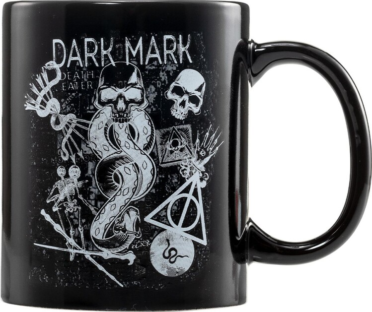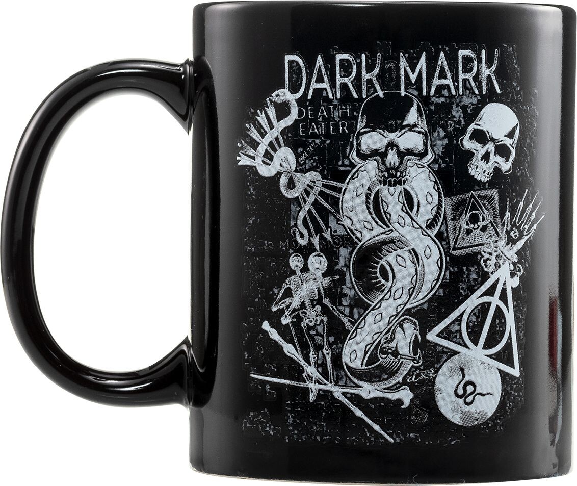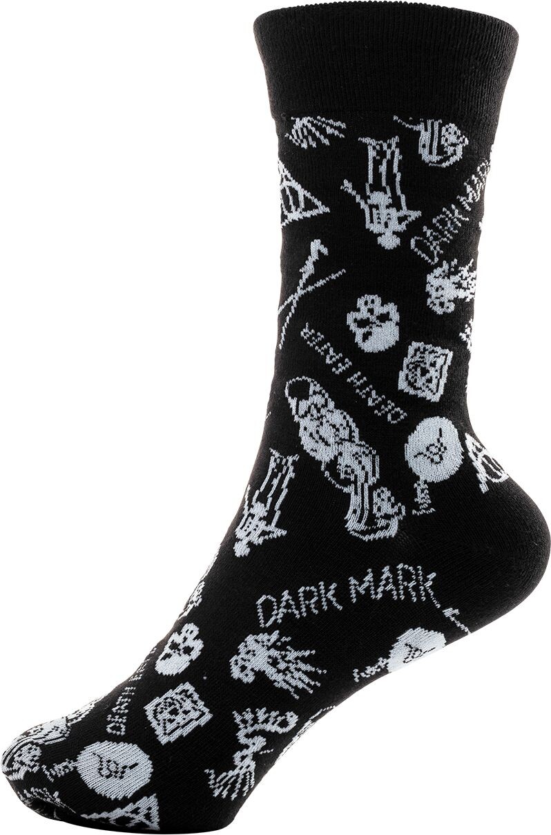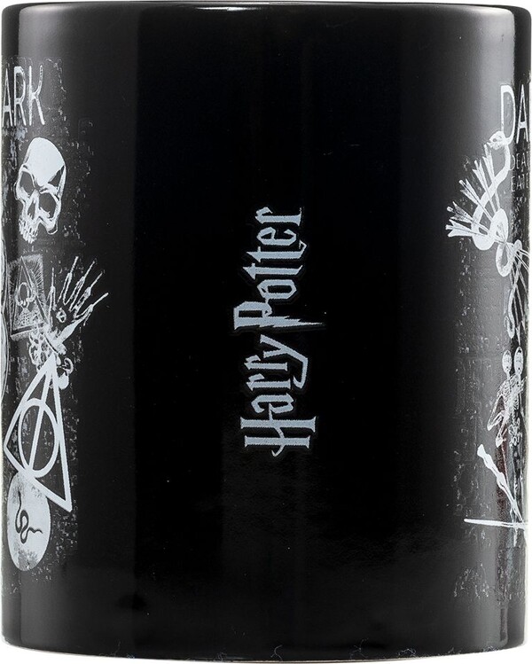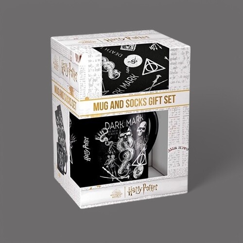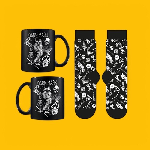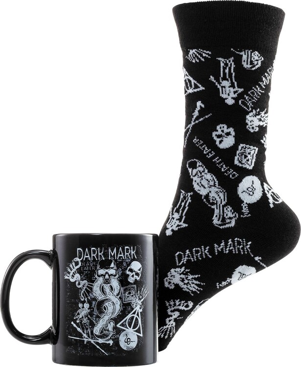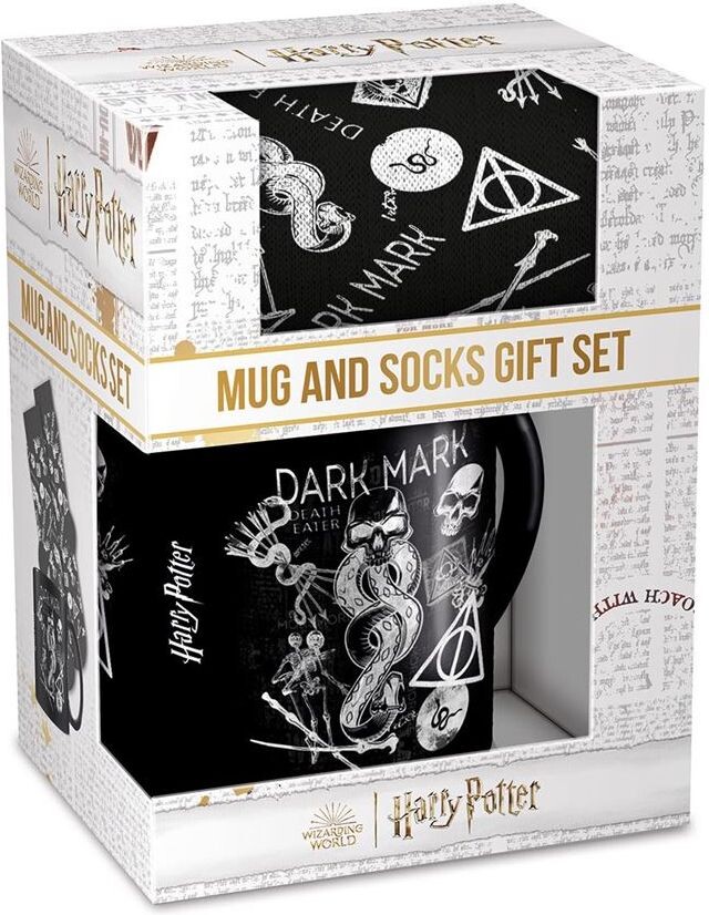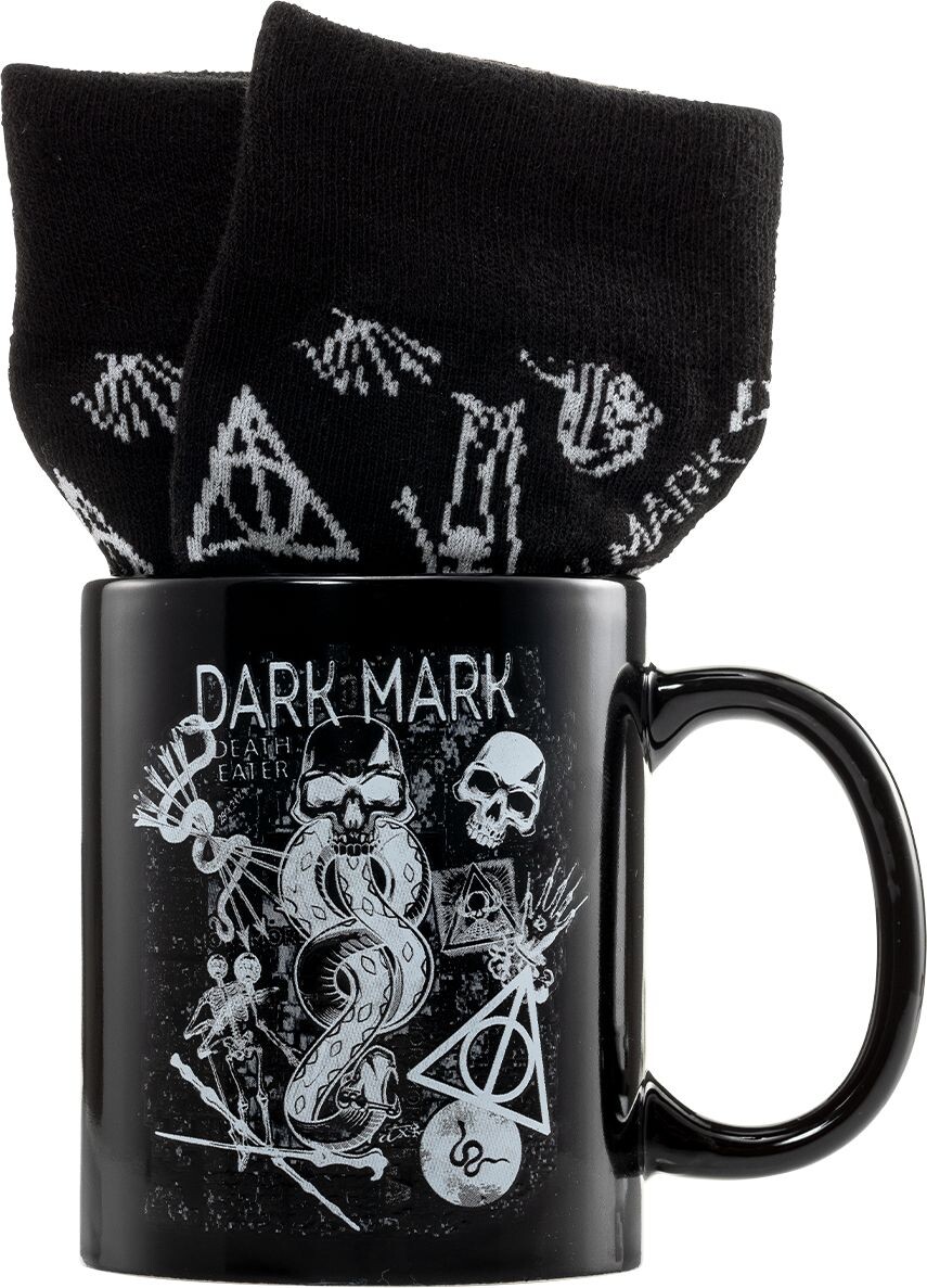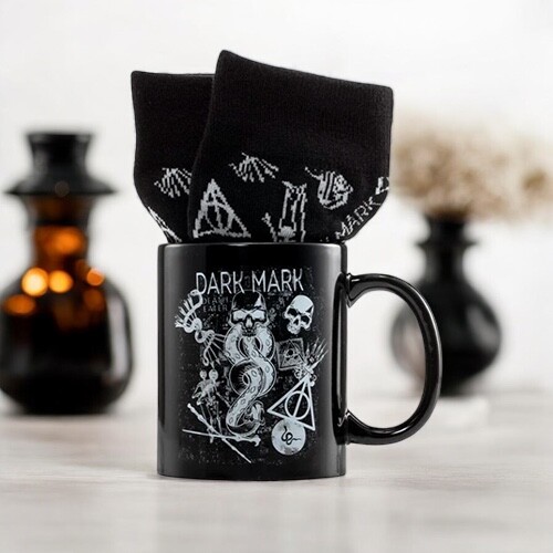 Tajemný dárkový set s motivem Temné magie z kouzelnického světa Harryho Pottera obsahuje keramický hrnek o objemu 315 ml a pohodlné ponožky univerzální velikosti 41–45 v tematickém balení.