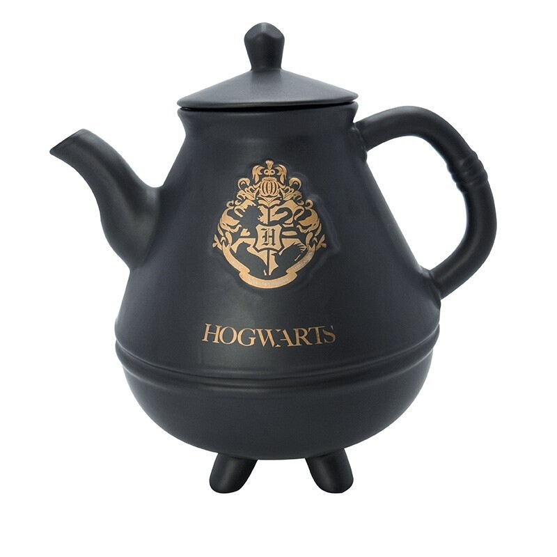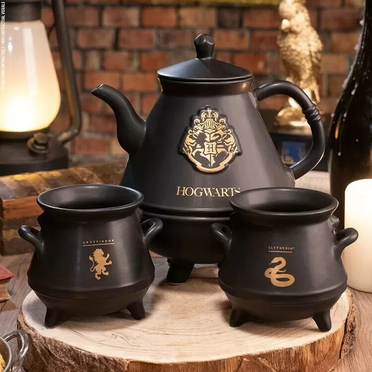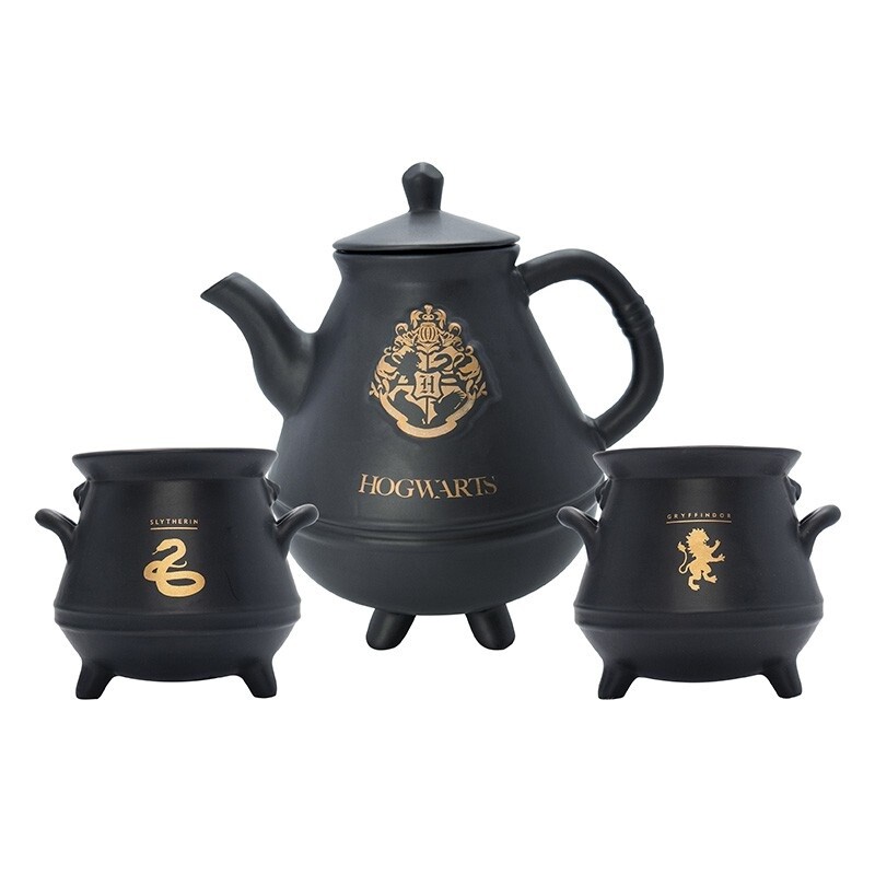 Čajový set obsahuje keramickou čajovou konvici s objemem 1 litru a dva hrnky ve tvaru kotlíku s objemem 0,25 litru. Jeden se zlatým erbem Nebelvíru a druhý se symbolem Zmijozelu. Čajový set není vhodný do myčky na nádobí ani do mikrovlnné trouby. Pouze ruční mytí.