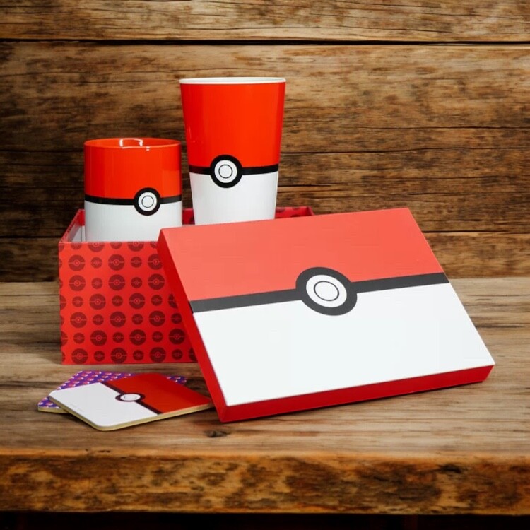 Sběratelská sada pro milovníky Pokémona obsahuje půllitrovou sklenici, 400 ml keramický hrnek a 2 podtácky – vše se stylovým motivem Pokeballu.