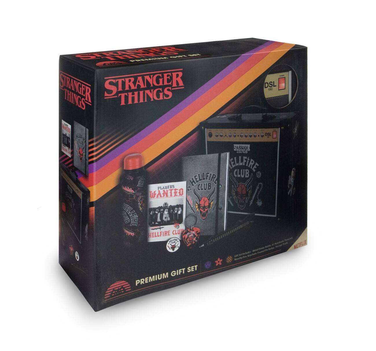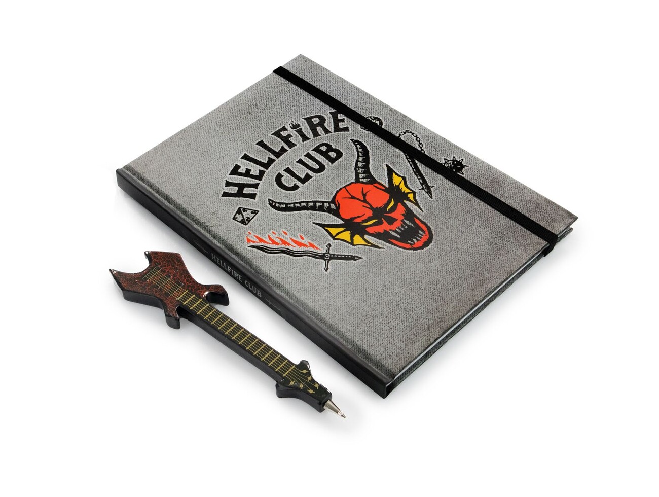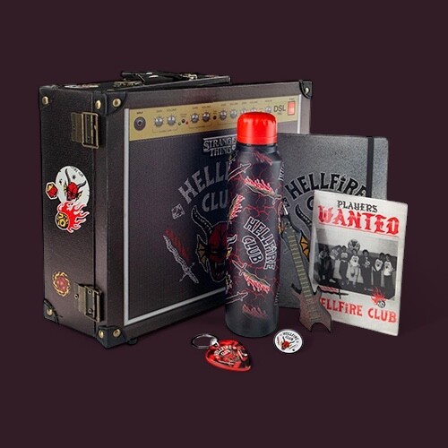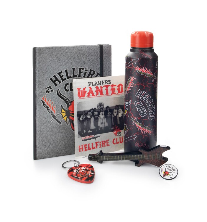 Exkluzivní dárková sada Stranger Things 4: Hellfire Club obsahuje 525 ml kovovou láhev, zápisník A5 s 80 listy, stylové pero ve tvaru elektrické kytary, přívěsek na klíče, smaltovaný odznak a pohlednici, vše s motivem Hellfire Clubu.