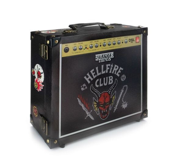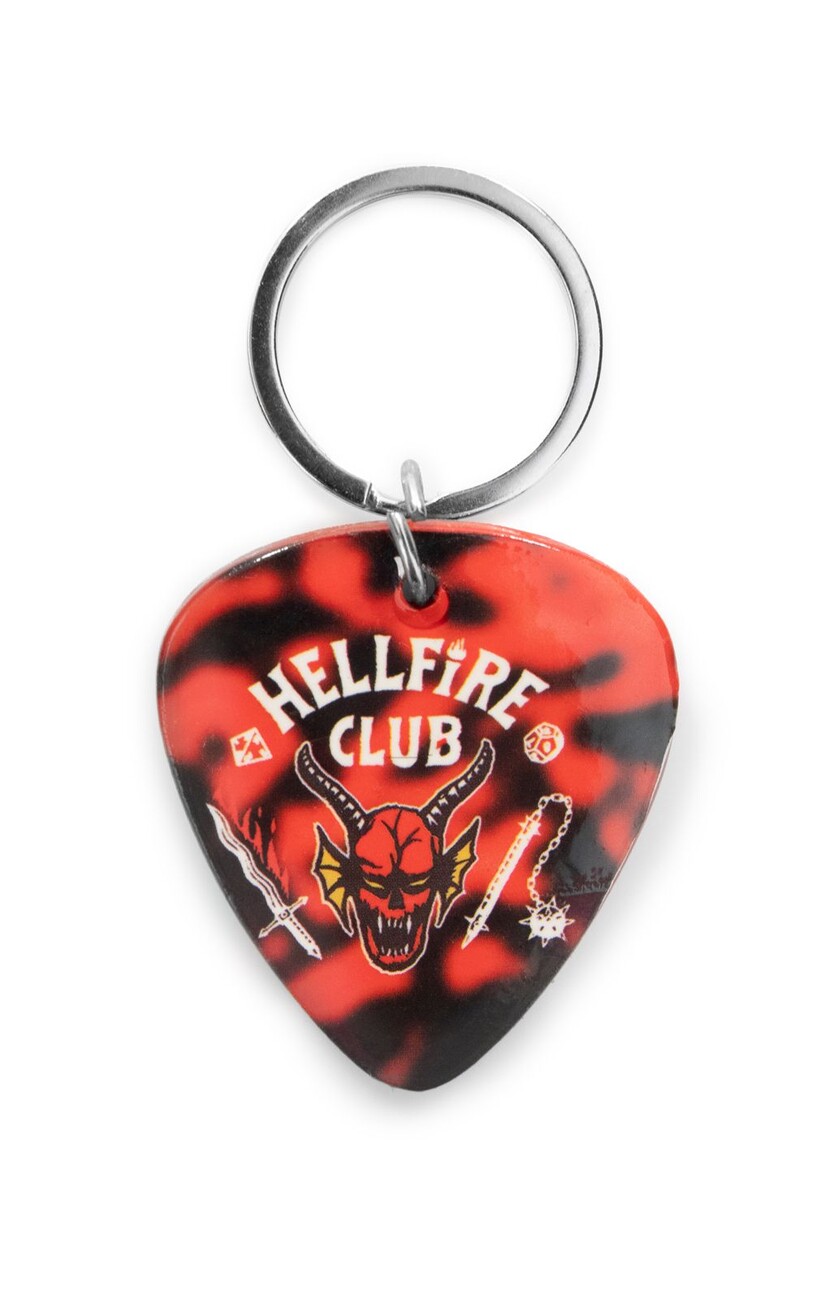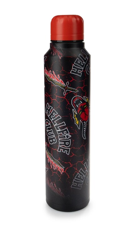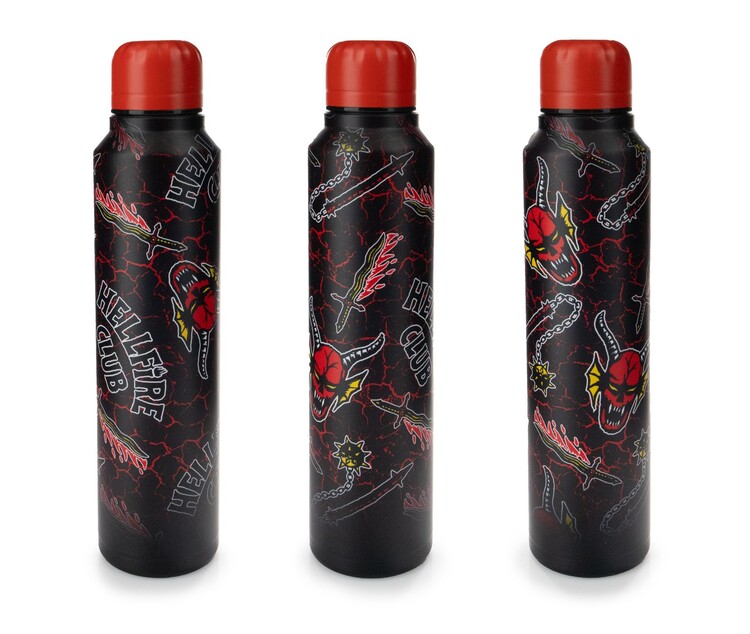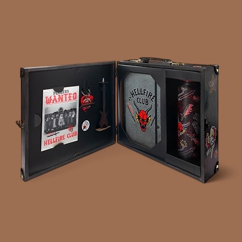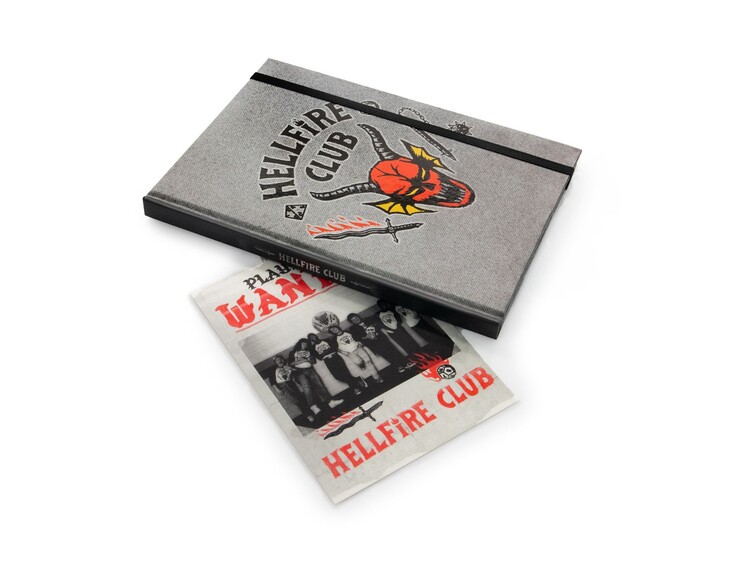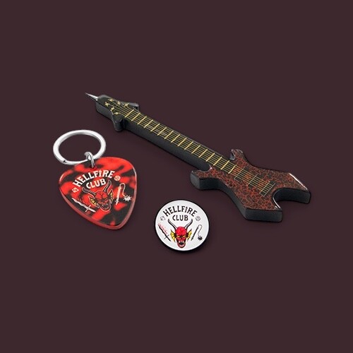 Exkluzivní dárková sada Stranger Things 4: Hellfire Club obsahuje 525 ml kovovou láhev, zápisník A5 s 80 listy, stylové pero ve tvaru elektrické kytary, přívěsek na klíče, smaltovaný odznak a pohlednici, vše s motivem Hellfire Clubu.