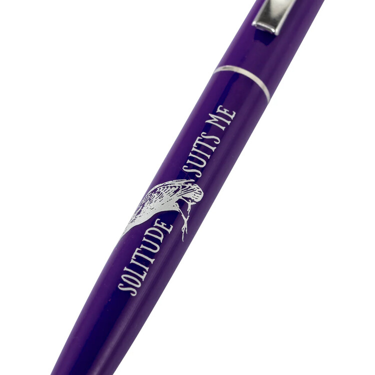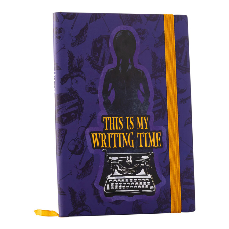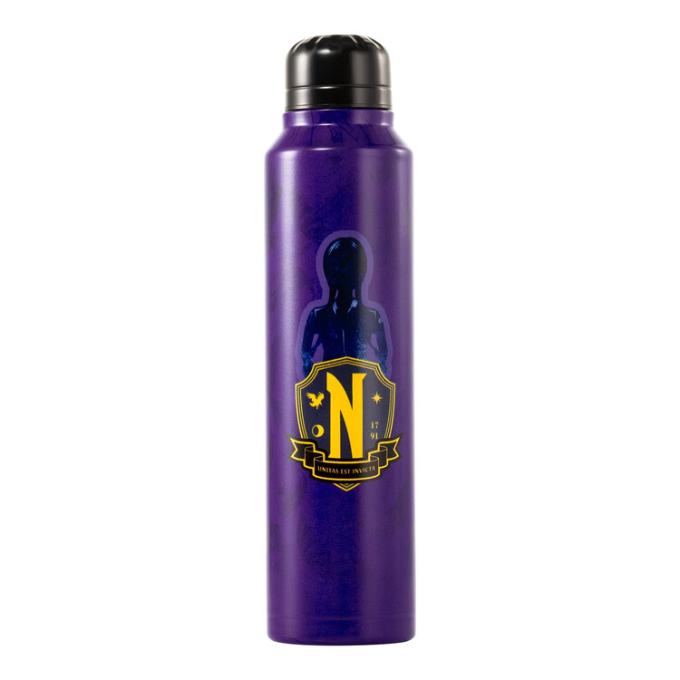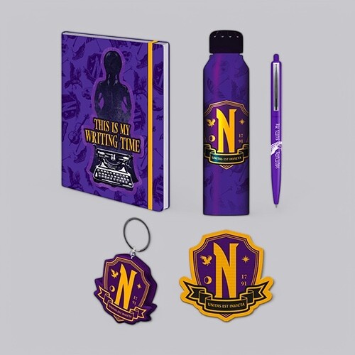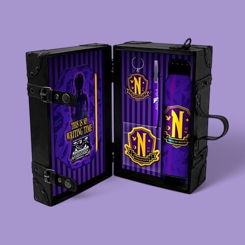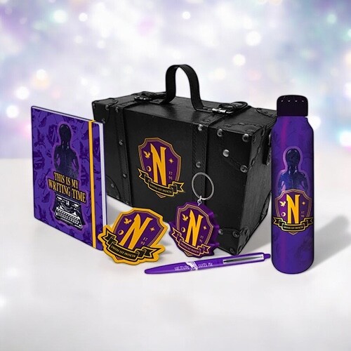 Exkluzivní dárková sada s motivem filmové Wednesday obsahuje kovovou láhev (350 ml), elegantní kuličkové pero, zápisník formátu A5, přívěsek na klíče, stylovou nášivku a praktický úložný box o rozměrech 26 × 17 × 13 cm.