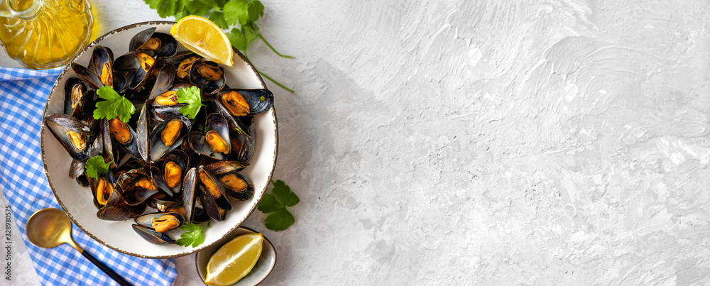 Obraz na plátně Delicious and healthy steamed mussels on white background
