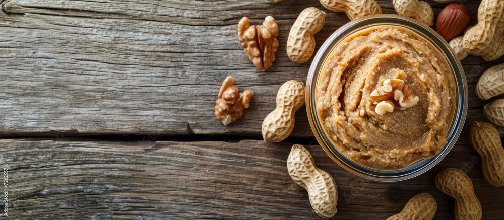 Fotografie Delicious Peanut or Ground Nut Spread Over a Rustic Wooden Background - Nutty, N