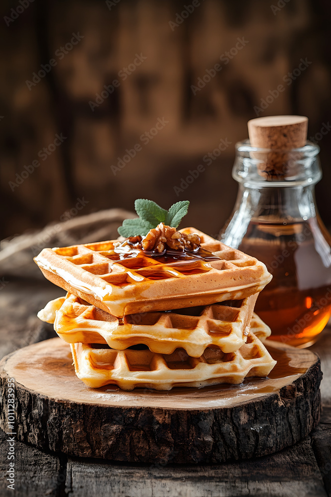 Fotografie delicious waffles with syrup and nuts on rustic wooden table