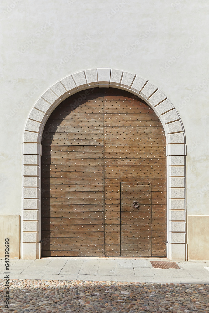 Fotografie Detail, of a wooden gate ornately decorated with iron rivets, on a building in Tuscany, Italy
