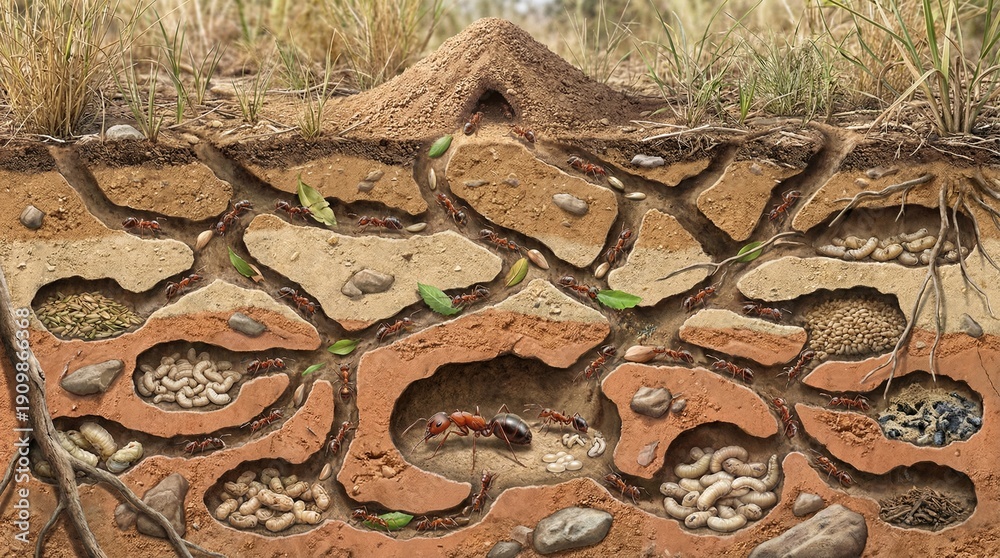 Fotografie Detailed underground ant colony with organized chambers and busy workers