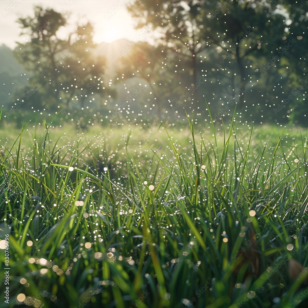 Fotografie Dewy Morn: A Field of Tall Grass Bathed in Sunlight and Drops