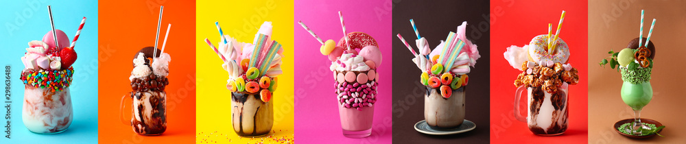 Fotografie Different delicious freak shakes on colorful background