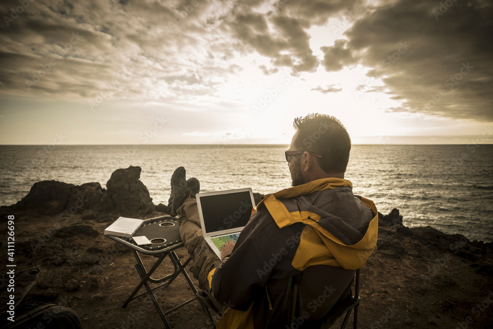 Fotografie Digital nomad people at work outdoor with computer laptop and 5g internet connec