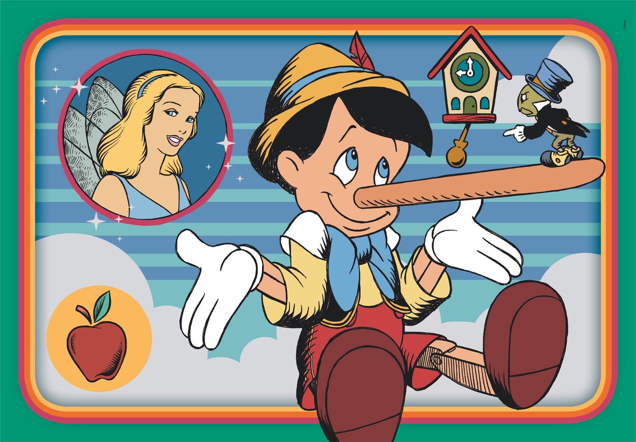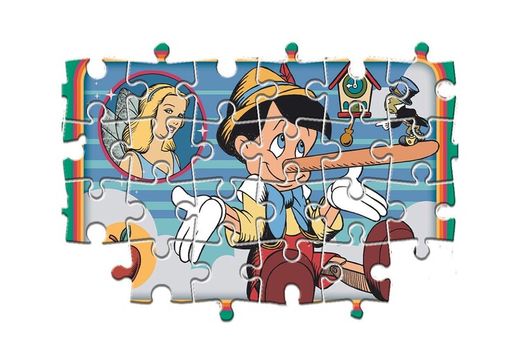 Dvoje puzzle Peter Pan a Pinocchio (2×60 dílků). Veselé ilustrace klasického Disney potěší malé fanoušky; jasné barvy usnadňují třídění. Děti si přirozeně trénují jemnou motoriku i soustředění. Puzzle Clementoni mají ostrý tisk a precizní výsek, takže skládání jde skoro samo. Baleno v robustní, elegantní krabici.