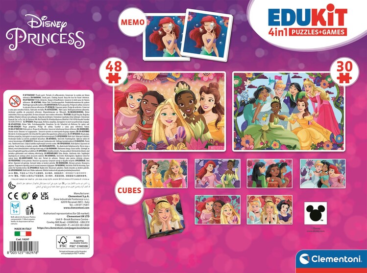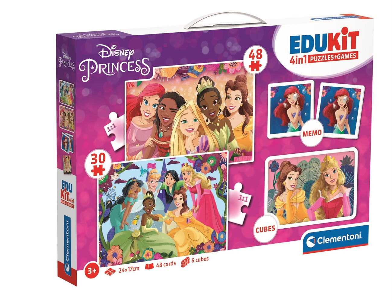 Jedna krabice, tři hry: puzzle 30 dílků, puzzle 48 dílků, 6 plastových kostek a pexeso. Pestrá společná zábava, která rozvíjí jemnou motoriku i soustředění. Dílky přesně lícují a hladce zapadají, takže skládání jde skoro samo. Baleno v robustní, elegantní krabici.