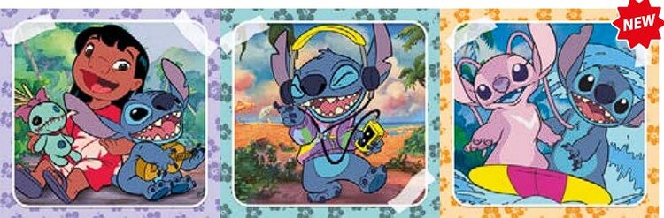 Sada 3 puzzle Stitch (3×48 dílků). Veselé, hravé motivy vtáhnou do hry, jasné barvy usnadňují třídění. Dílky se dobře drží a hladce do sebe zapadají, děti si tak přirozeně trénují jemnou motoriku i soustředění. Puzzle Clementoni vynikají ostrostí tisku a přesným výsekem, takže skládání jde skoro samo. Baleno v robustní, elegantní krabici.