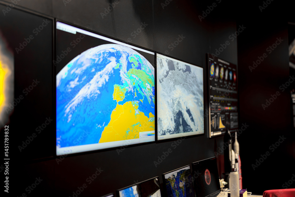 Obraz na plátně Displays show detailed satellite imagery in a monitoring room for a space explor