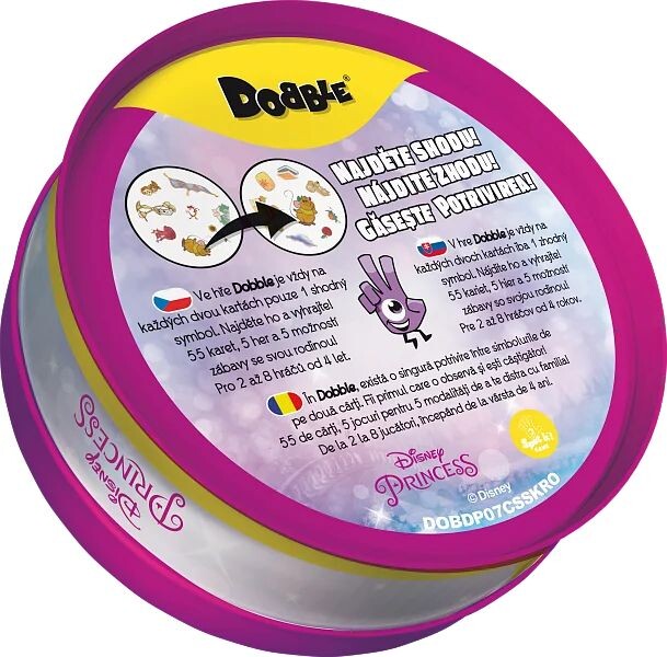 Oblíbená postřehová hra Dobble na motivy Disney princezen, postaviček a charakterů.