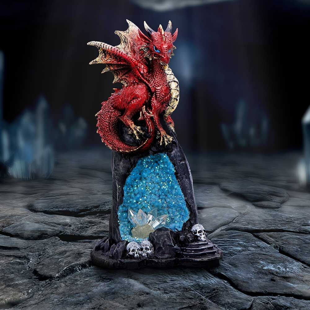 Objevte kouzlo Crystal Cave Dweller, dechberoucí dračí figurky, která spojuje fantazii s gotickou elegancí. Odlitá z vysoce kvalitní pryskyřice a ručně malovaná, zobrazuje majestátního červeno-zlatého draka usazeného na krystalové jeskyni, která se třpytí metalickými tóny nad zářivým modrým geodovým podstavcem. Ohnivé barvy v kontrastu s krystalickou jeskyní tvoří dramatický středobod každé fantasy poličky, gotického interiéru či sbírky. Zabaleno v dárkové krabičce s logem, perfektní pro obdarování nebo ochranu při skladování.