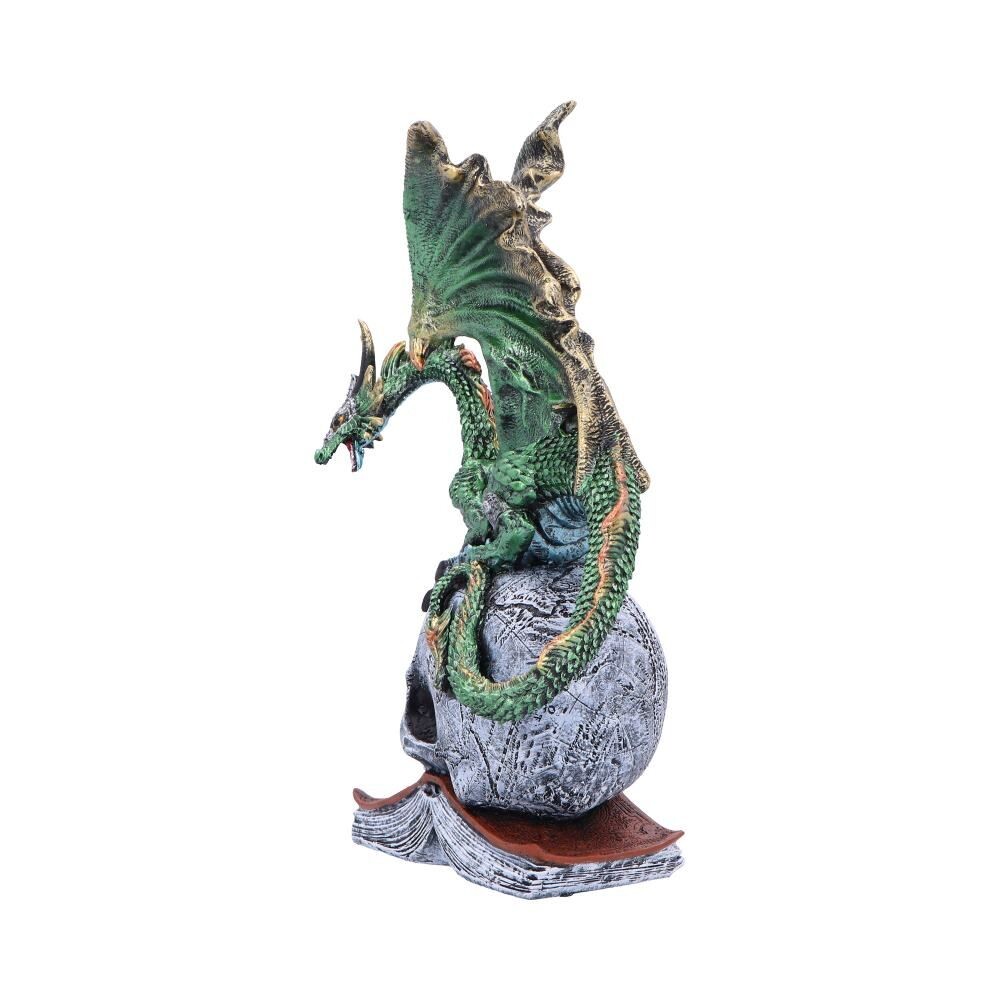 Tato zelená dračí figurka ukazuje ručně malovaného tvora usazeného na kovové lebce, s detailními šupinami doplněnými o zlaté rohy a křídla. Mistrně vyrobena z prémiové pryskyřice s metalickými detaily, představuje fascinující sběratelský kousek pro fanoušky fantasy, gotického dekoru i obdivovatele draků. Zabaleno v dárkové krabičce s logem, perfektní pro obdarování nebo ochranu při skladování.