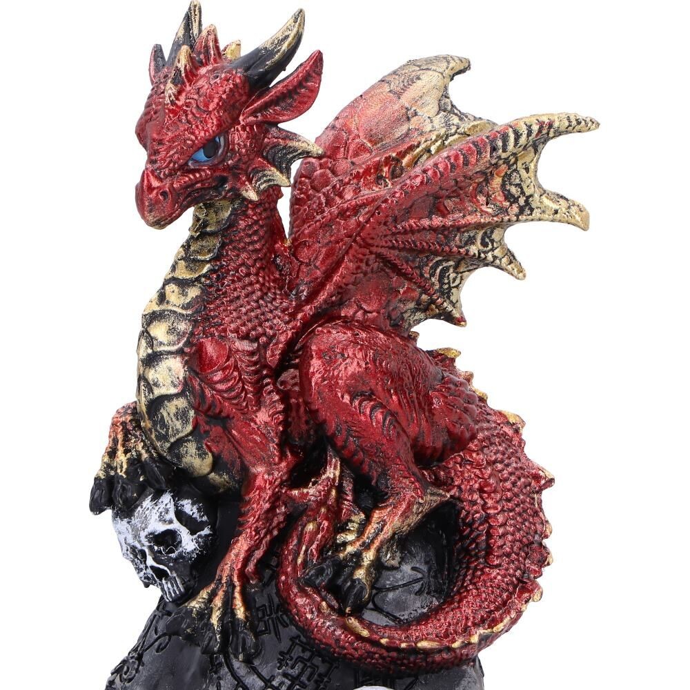 Tato karmínová figurka zobrazuje rudého tvora usazeného na černé gotické věži. Je ručně malovaná, s rubínově červenými metalickými šupinami a zlatými detaily na křídlech, což jí dodává výrazný a jedinečný vzhled. Vyrobena z prémiové pryskyřice, jejíž podstavec zdobí lebkové motivy, představuje odvážný sběratelský kousek pro milovníky fantasy, gotického dekoru i fanoušky draků. Dodává se v dárkové krabičce s logem – ideální pro obdarování i bezpečné skladování.