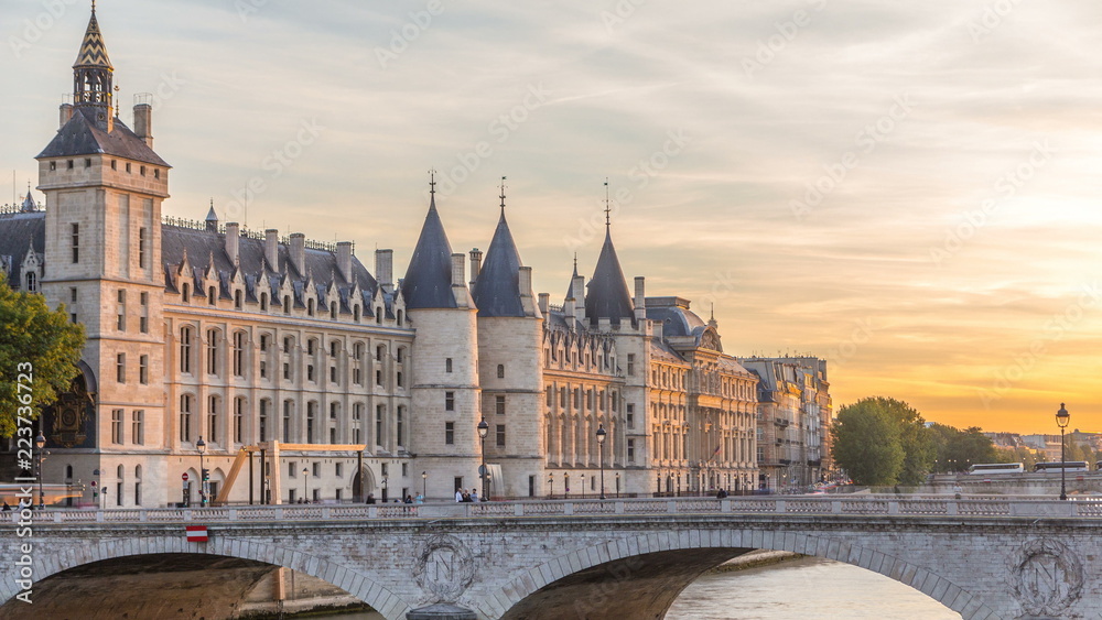Obraz na plátně Dramatic sunset over river Seine and Conciergerie timelapse in Paris, France