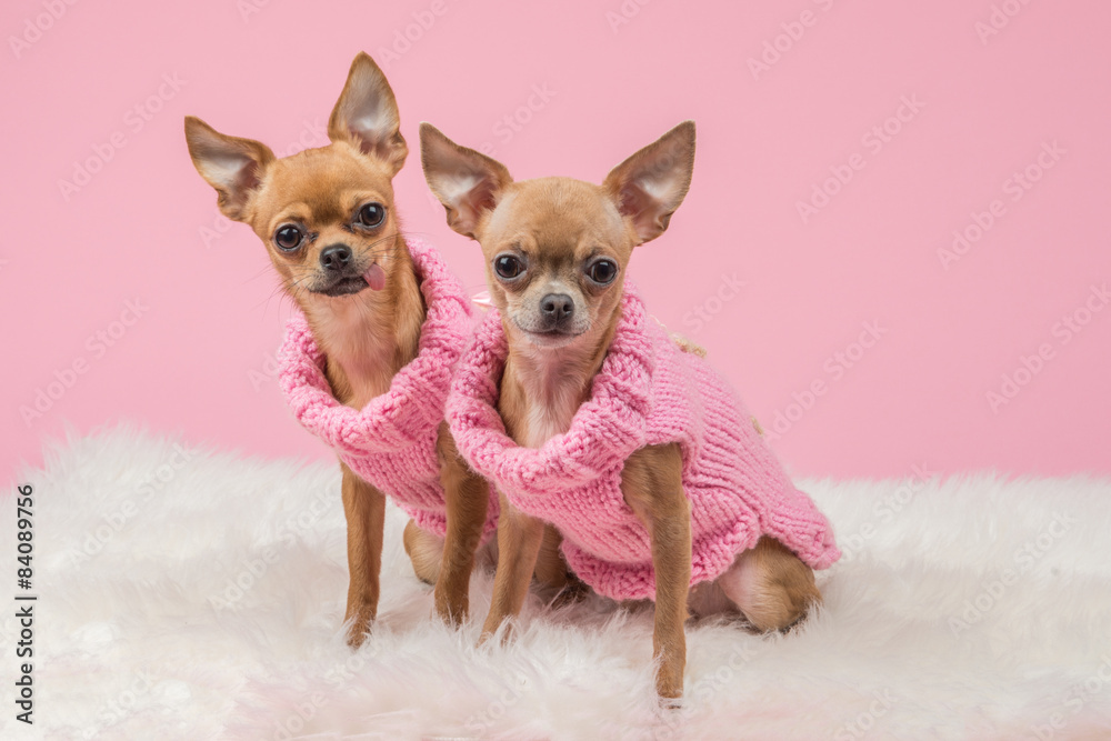 Dressed cute chihuahua dogs in pink knitted sweaters and at a pink background