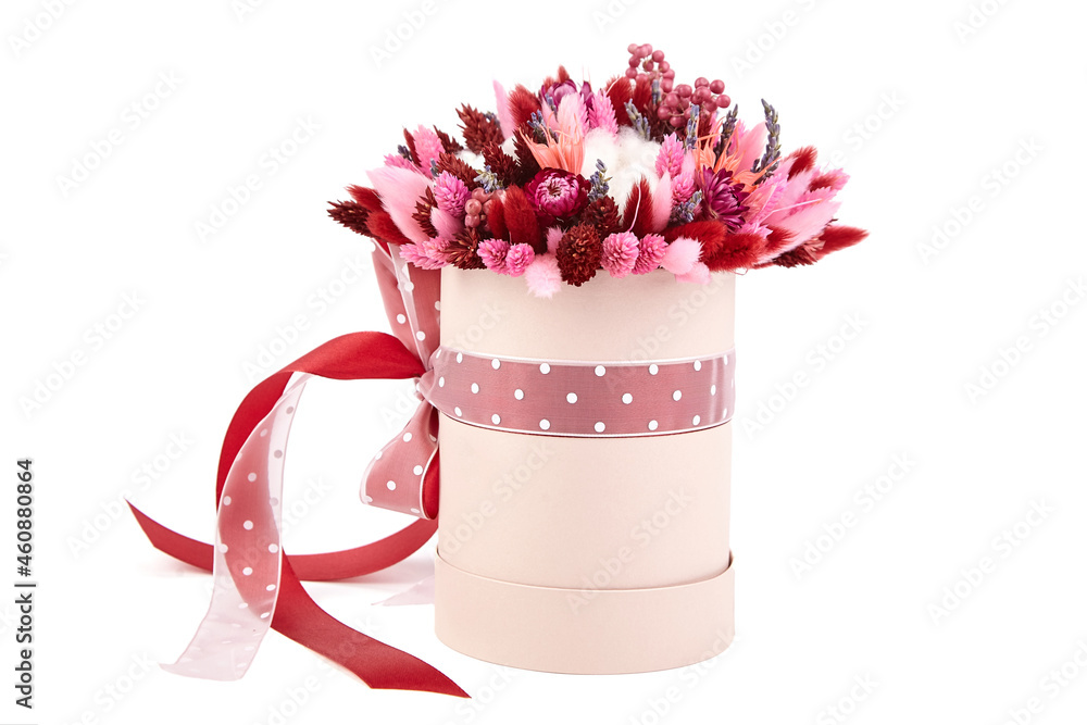 Fotografie Dried flower bouquet with grasses in pink round hat box isolated on white