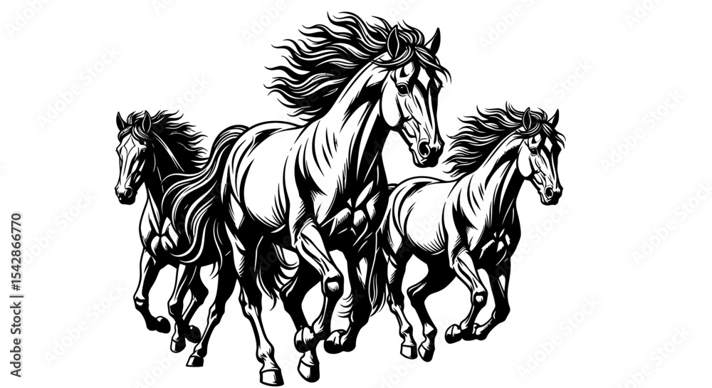 Fotografie Dynamic Black and White Horses Running in Vector Art Style