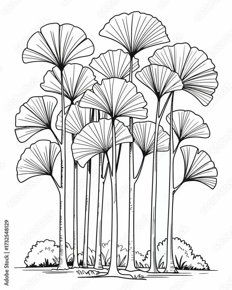 Fotografie Elegant Ginkgo Trees Black and White Line Art Illustration Detailed Forest Scene