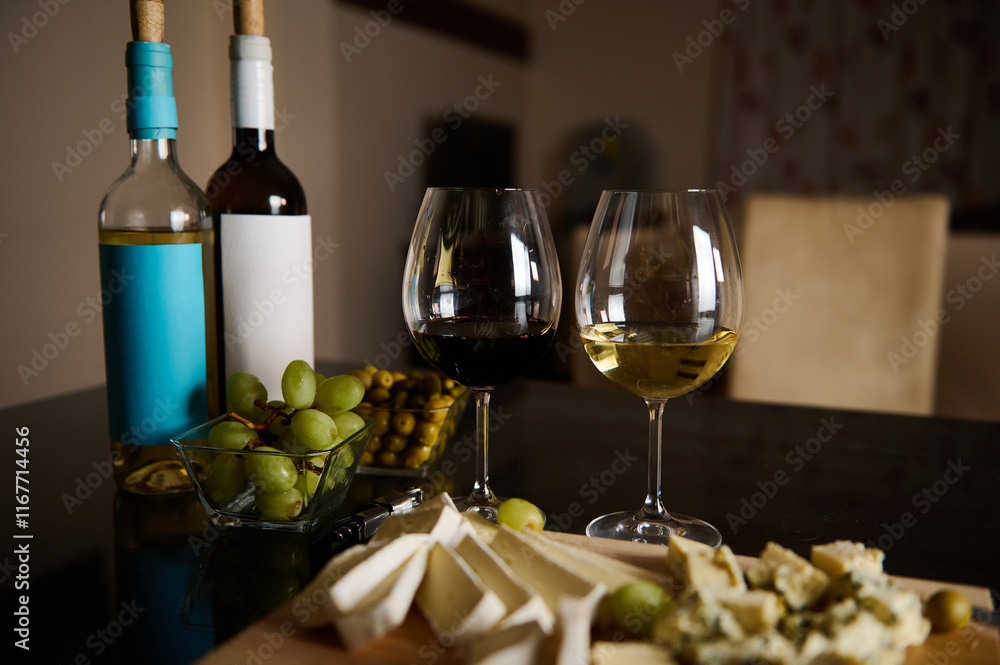 Obraz na plátně Elegant wine tasting setting with assorted cheeses and fresh grapes