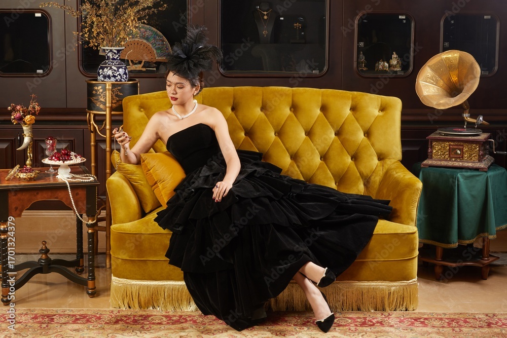Fotografie Elegant woman in a black dress sitting on a vintage yellow couch.