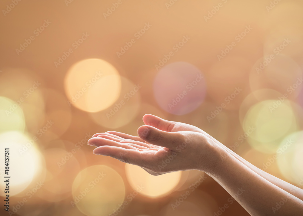 Fotografie Empty female women open human hand prayer palms up Candle night light natural warm gold lantern bokeh Pray support aid destiny help peace campaign: Holy spirit week: World religion day: Eid mubarak