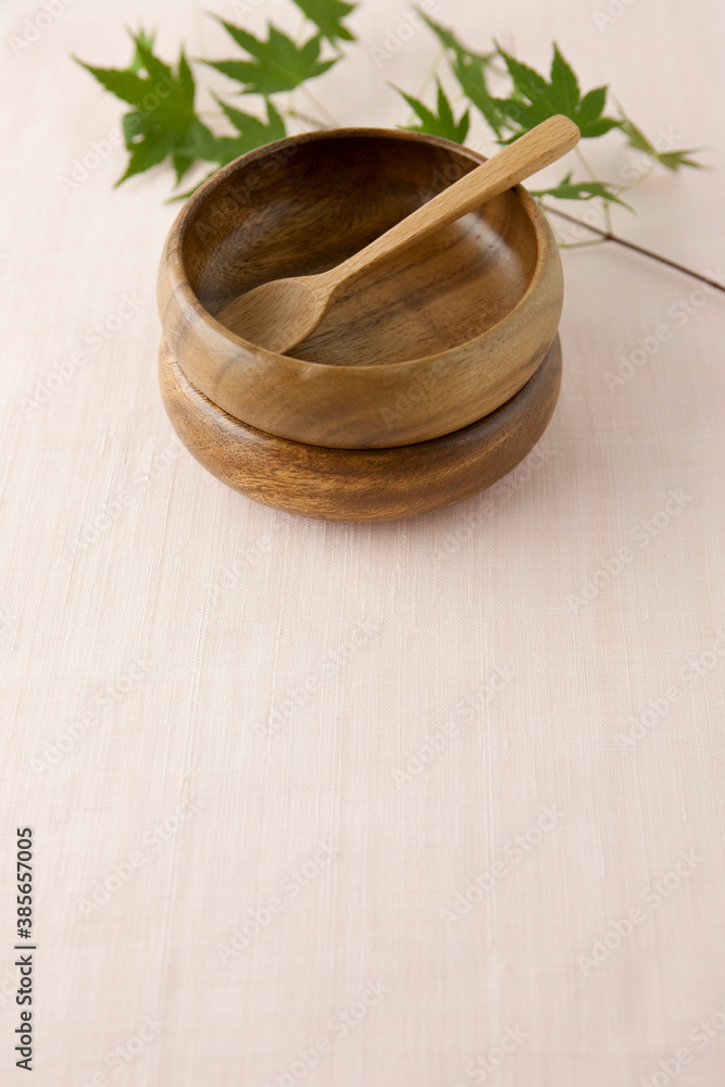 Fotografie Empty wooden plates and maple leaves on pink ramie cloth.