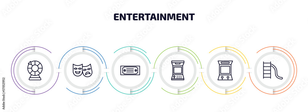 Fotografie entertainment infographic element with outline icons and 6 step or option