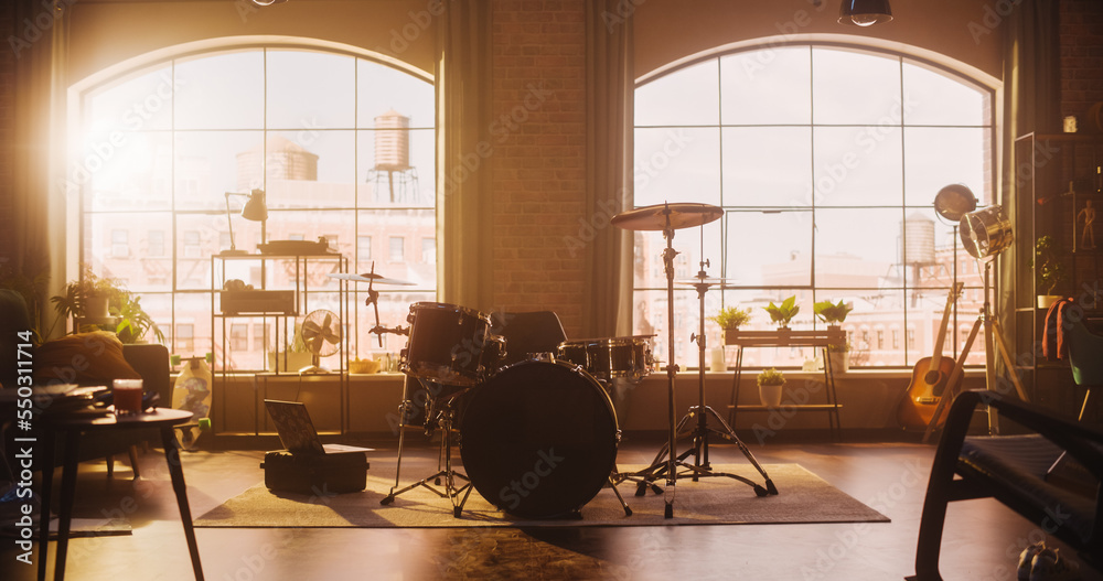 Fotografie Establishing Shot: Music Rehearsal Studio in Loft Room with Drum Set in the Middle