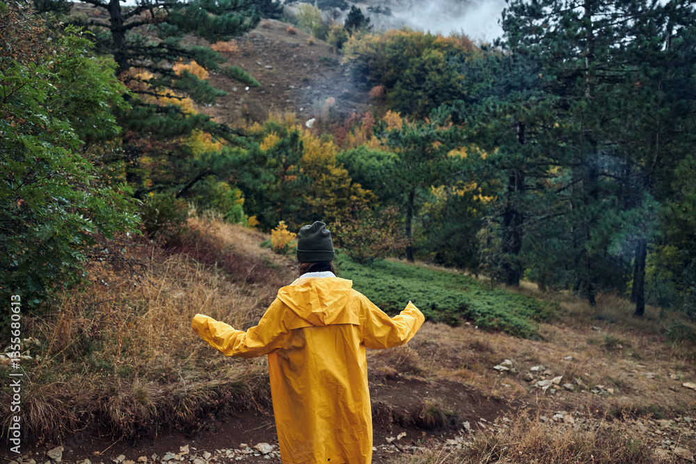 Fotografie Exploring the Serene Beauty of Nature A Person in a Yellow Raincoat Embracing th