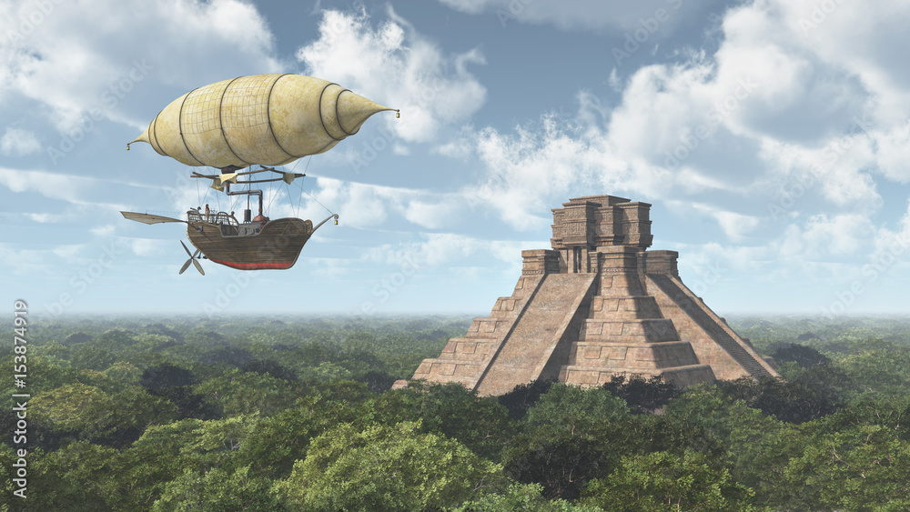 Fotografie Fantasie Luftschiff und Maya Tempel