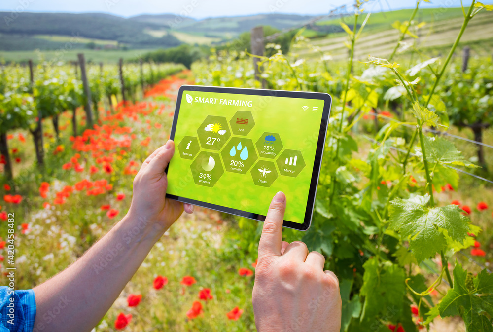 Obraz na plátně Farmer using smart farming technologies in a vineyard.