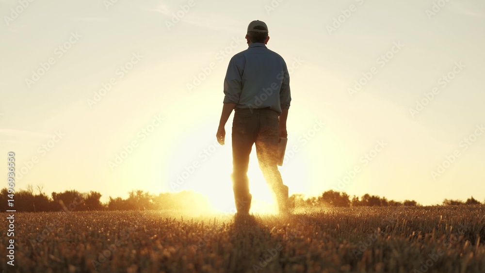 Obraz na plátně Farmer walking through wheat field in rubber boots, , agriculture, business of f