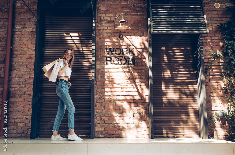 Fotografie Fashionable dressed young woman with shopping bags posing near brown metal shutters background