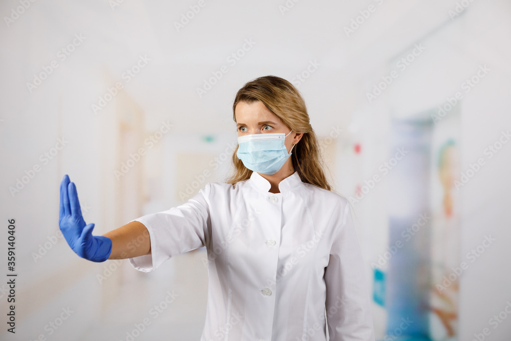 Fotografie Female doctor in face mask showing stop sign with her hand