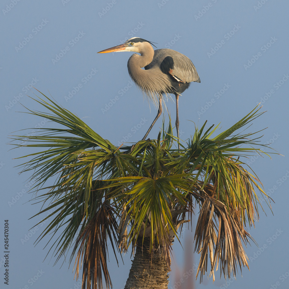 Fotografie Female Great Blue Heron standing alone on nest on top of a palm tree against a c