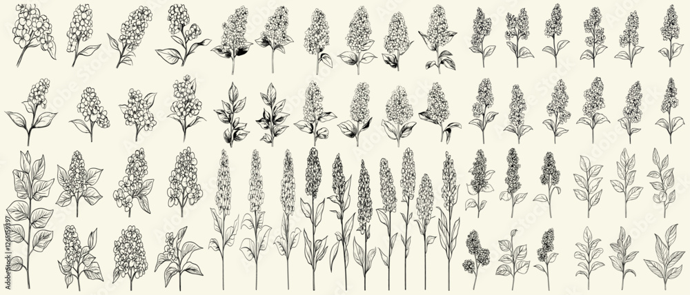 Fotografie Feminine botanical floral branch, trendy greenery, hand drawn wedding herbs for branding and decor, minimalist black line art lilacs for wedding logos and invitations, floral wedding branding