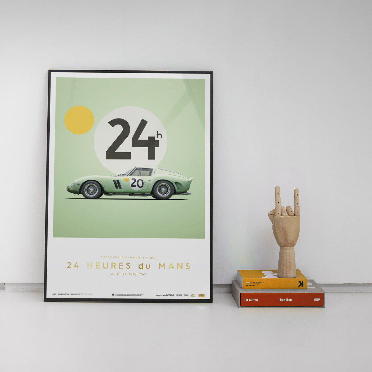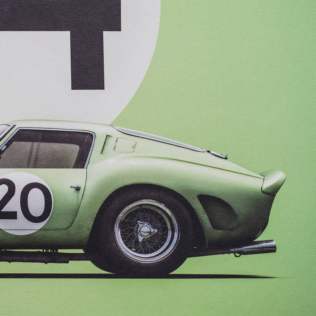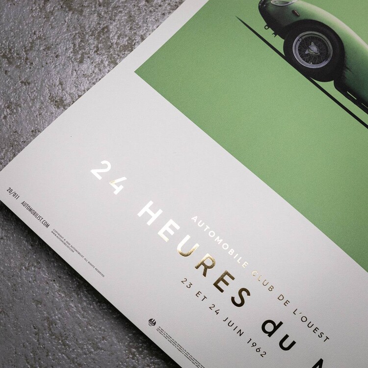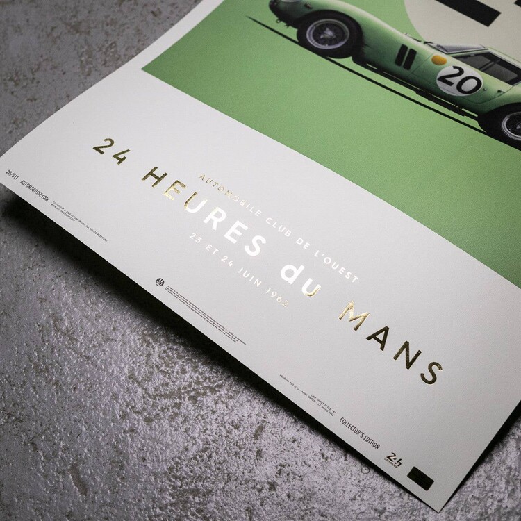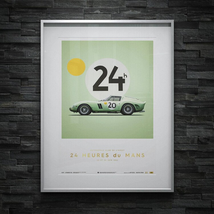 Few cars are held in such high regard as the Ferrari 250 GTO. Created between 1962-1964 by a team led by Giotto Bizzarrini, each buyer of the 39 produced had to be personally approved by Enzo Ferrari. The car has a great history in the Le Mans 24 Hours race, winning its class in 1962. But Le Mans can also break your heart and, that same year, this Number 20 GTO in our poster, in the hands of F1 drivers Masten Gregory (here at the wheel) and Innes Ireland, retired 15 hours into the race. In order to do a car like this justice, we’ve used a luxurious, thick paper stock – and limited the production run, just like the 250 GTO itself. For all of our posters we use high quality off-set printing, premium paper, and vibrant color reproduction that stands the test of time – just like the cars themselves. Each one is limited and labeled with a special hologram sticker to denote its authenticity.
