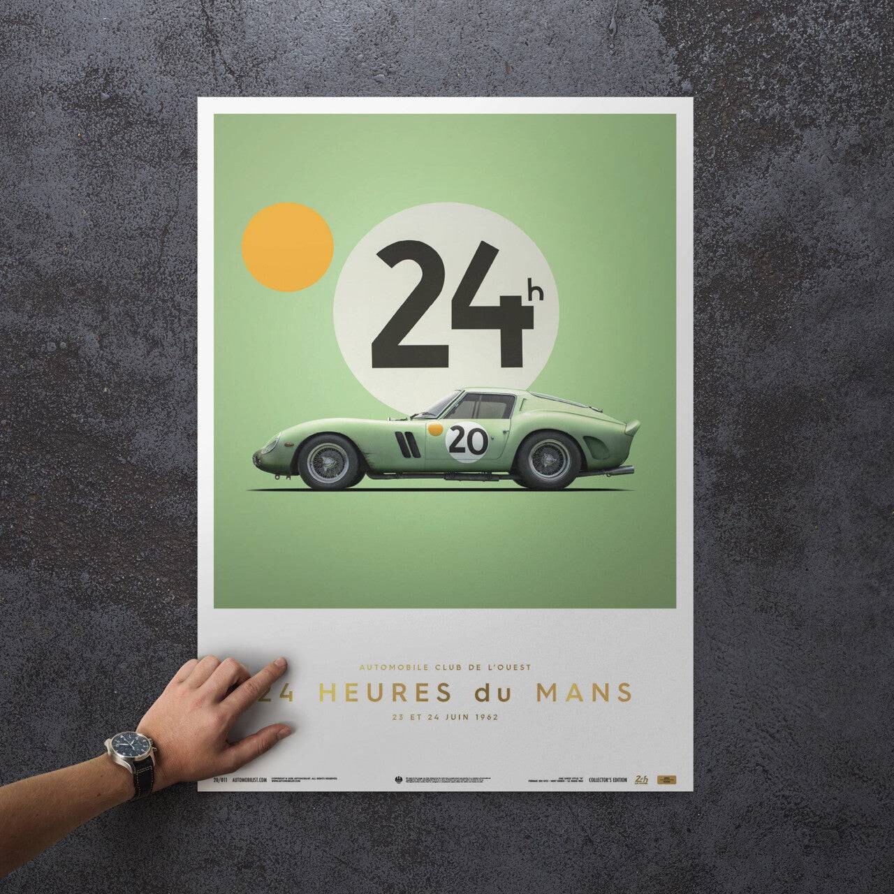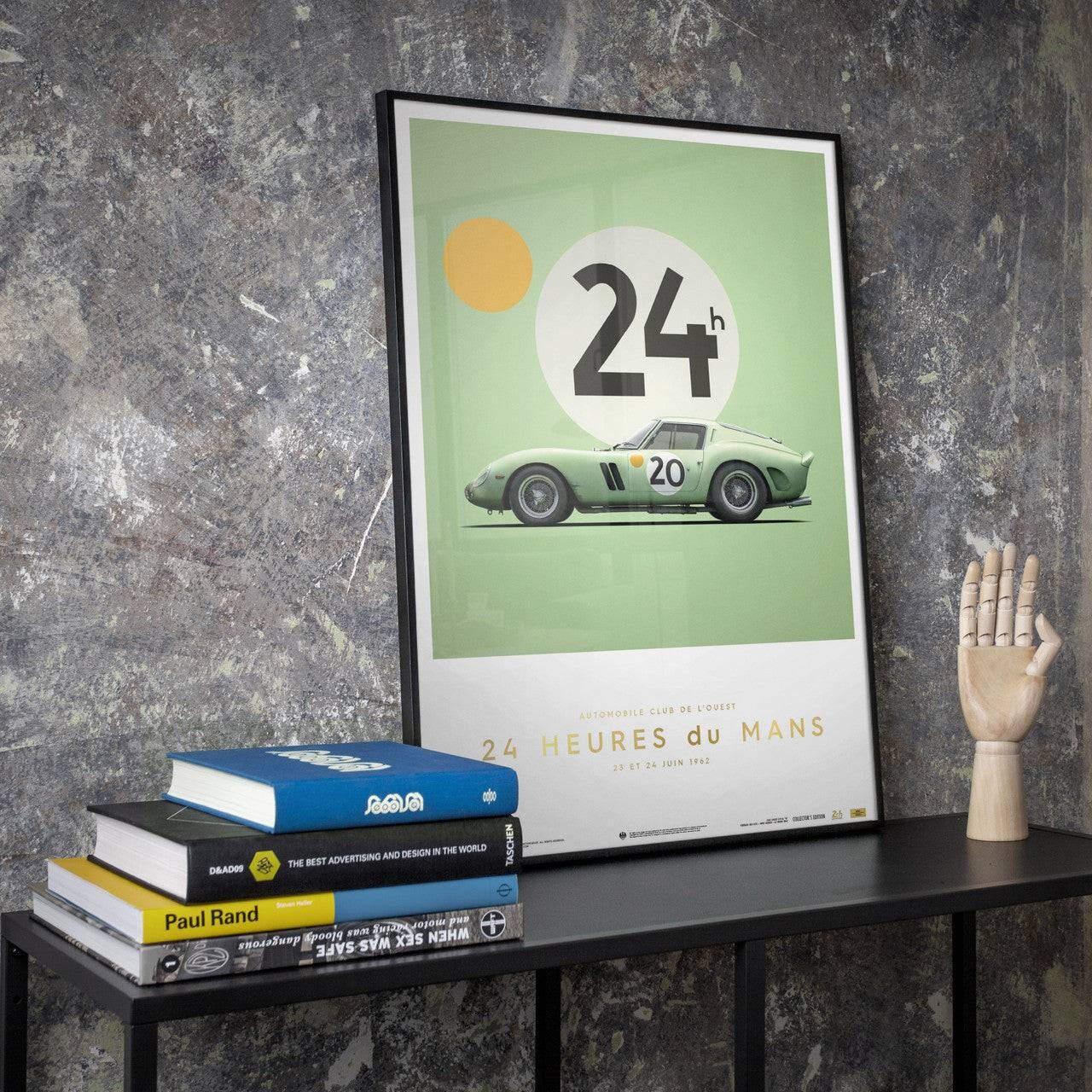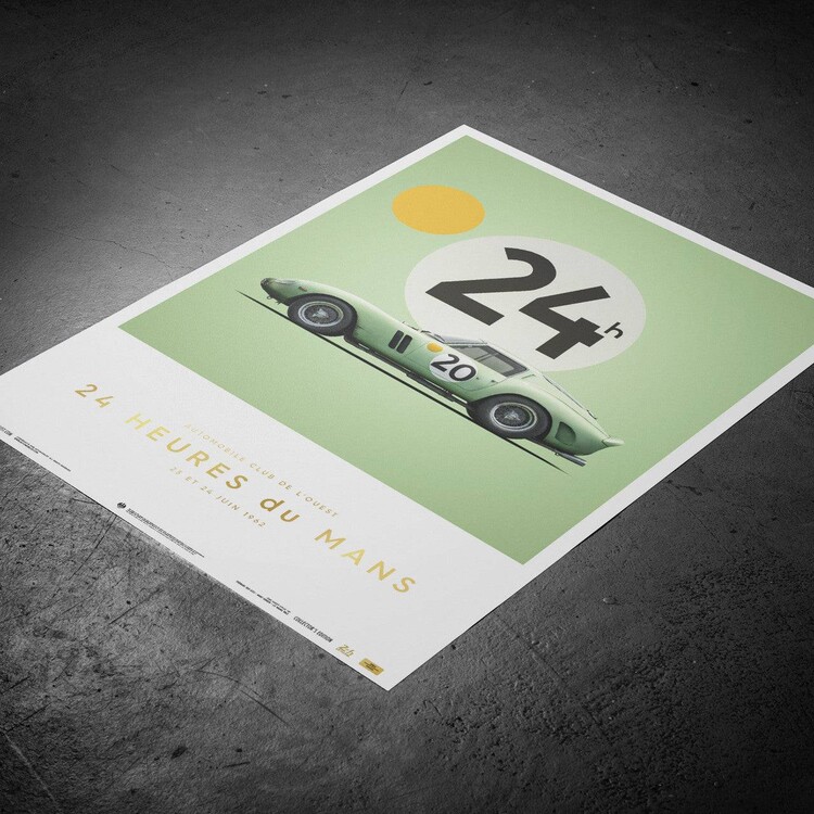 Few cars are held in such high regard as the Ferrari 250 GTO. Created between 1962-1964 by a team led by Giotto Bizzarrini, each buyer of the 39 produced had to be personally approved by Enzo Ferrari. The car has a great history in the Le Mans 24 Hours race, winning its class in 1962. But Le Mans can also break your heart and, that same year, this Number 20 GTO in our poster, in the hands of F1 drivers Masten Gregory (here at the wheel) and Innes Ireland, retired 15 hours into the race. In order to do a car like this justice, we’ve used a luxurious, thick paper stock – and limited the production run, just like the 250 GTO itself. For all of our posters we use high quality off-set printing, premium paper, and vibrant color reproduction that stands the test of time – just like the cars themselves. Each one is limited and labeled with a special hologram sticker to denote its authenticity.